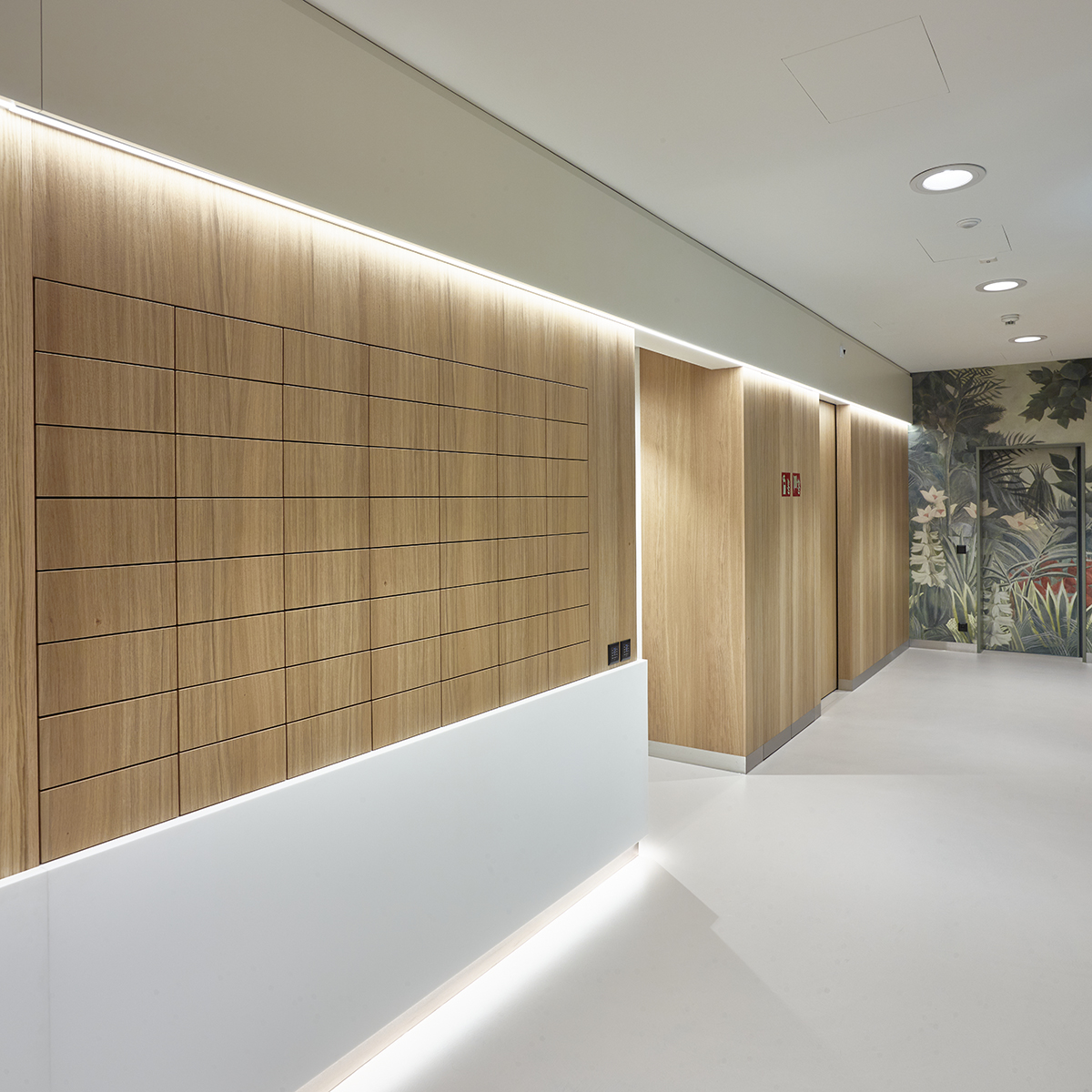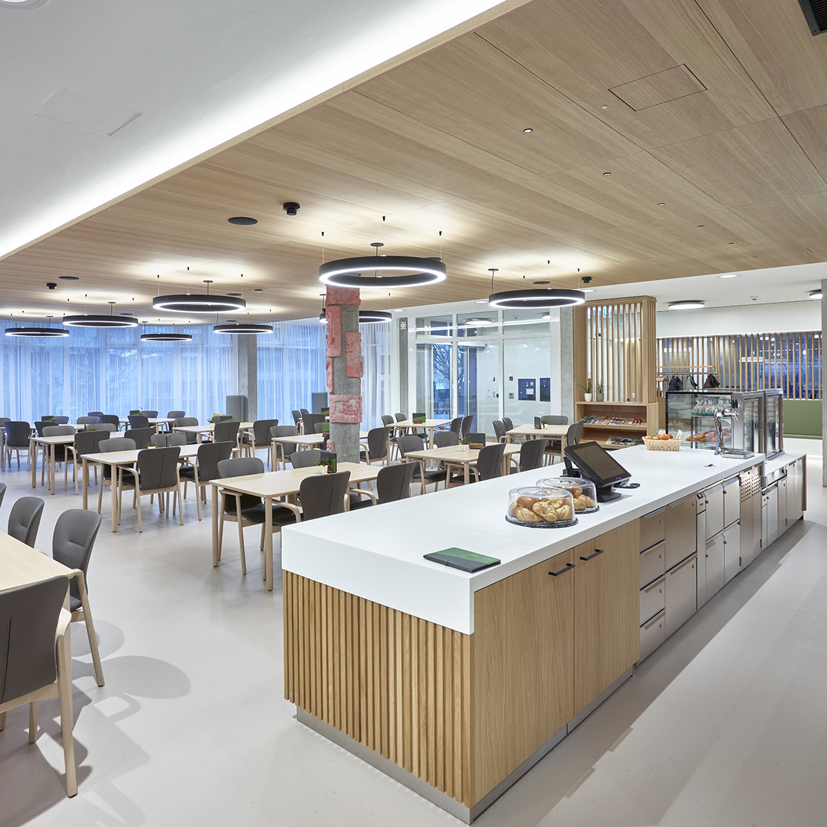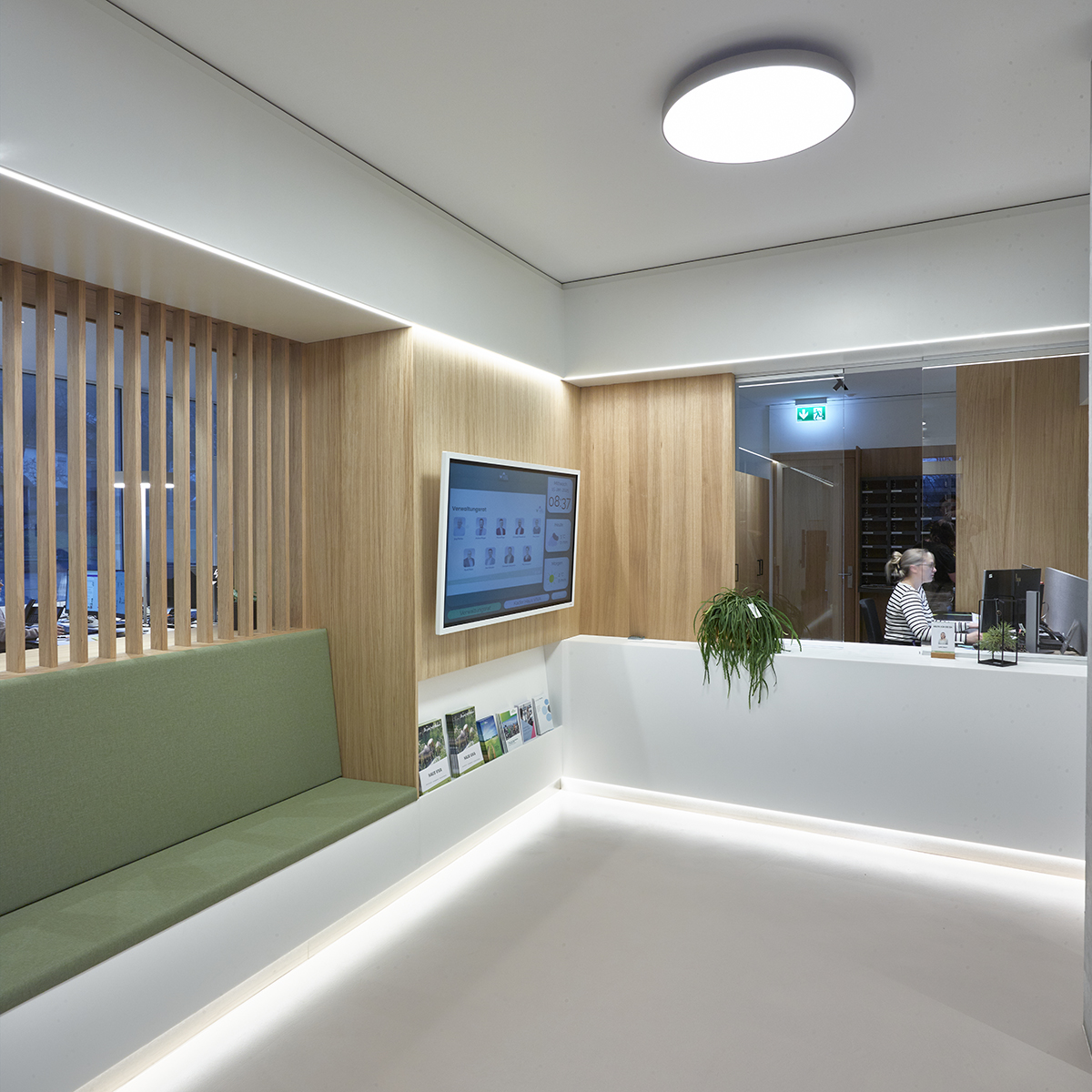 Die Eingangsbereich und Flure wurden mit einladendem angenehmem Licht gestaltet. Ansprechende Aufbauleuchten sowie indirekte Lichtlinien in den Empfangsmöbeln werten diese Bereiche atmosphärisch auf und bieten durch genügend Licht ausreichend Orientierung. Der zentrale Cafébereich wird durch eine besonders ausgeführte Holzdecke hervorgehoben. Durch runde Pendelleuchten entsteht eine warme und entspannende Atmosphäre, die die Besucher zum Verweilen einlädt. Die getrennt dimmbaren Anteile von direktem und indirektem Licht ermöglichen es individuell zu reagieren, dieser Bereich kann als Café aber auch zu Vorträgen u.a. genutzt werden. In den Verwaltungsbereichen kommen Magnetschienen zum Einsatz. Auf unterschiedliche Situationen können somit Strahler, Linsenprofile und diffuse Einsätze adäquat reagieren und für eine gute Ausleuchtung sorgen.